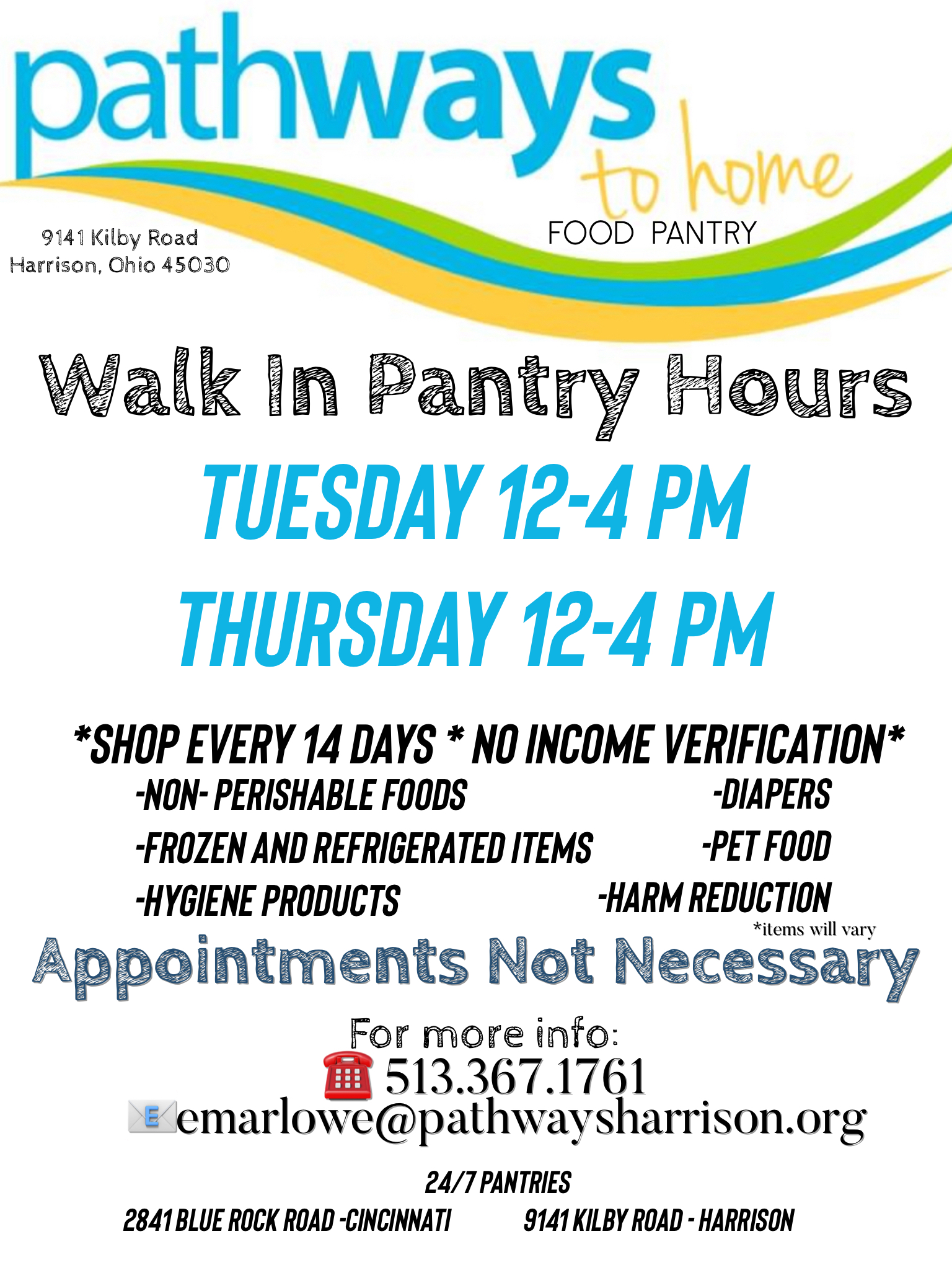 Our Give & Take Pantry Program includes four pantries that address food insecurity and basic needs. Our Harrison location houses an outdoor emergency pantry and indoor Choice Pantry. Our Colerain location operates an emergency and client-based delivery pantry.